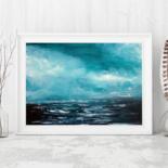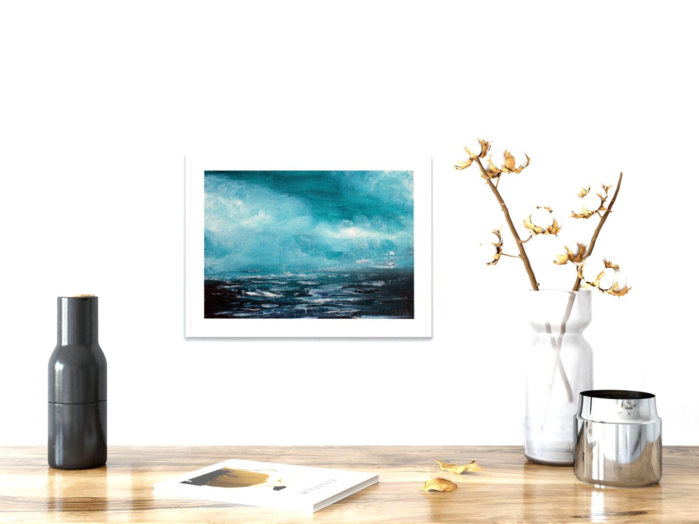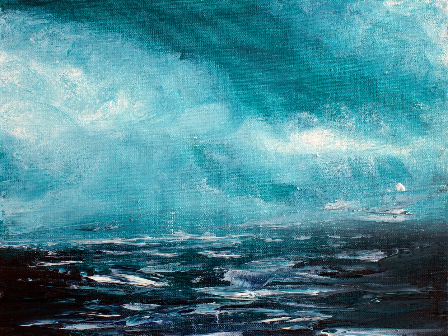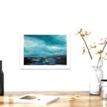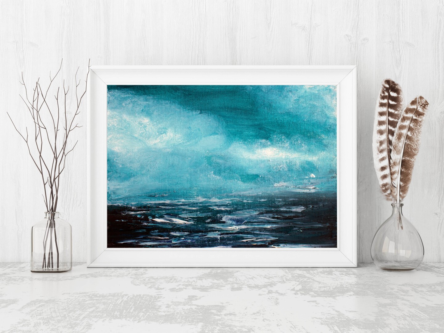 This captivating, small-format original oil painting is a study in atmosphere and textural depth. The composition features a dramatic contrast between a turbulent, deep indigo and black ocean surface and a sweeping, ethereal turquoise and cyan sky. The heavy application of paint (Impasto) creates a physical, sculptural quality, evoking the raw power of a restless sea under a vast, cloudy sky. Despite its small size, the painting commands attention through its intense color palette and emotional resonance.