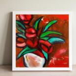 The composition radiates intensity through crimson tones balanced with vibrant greens and deep earthy shades. This work emphasizes mood over detail, presenting tulips not as objects, but as a powerful visual sensation.