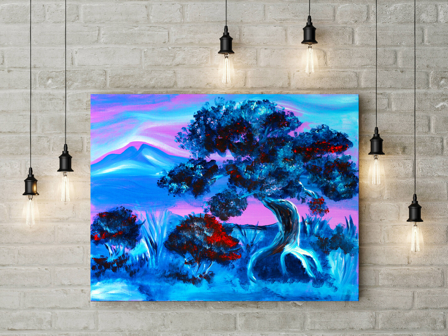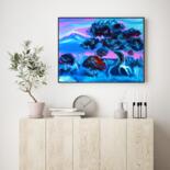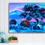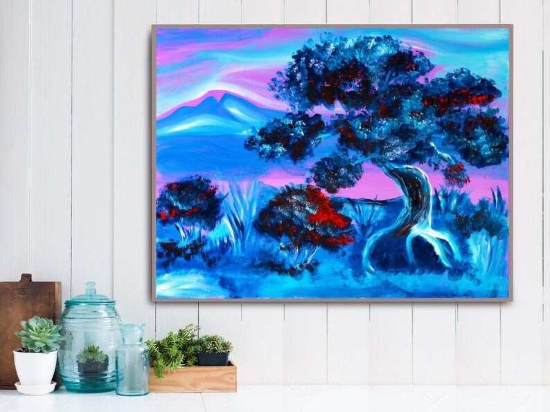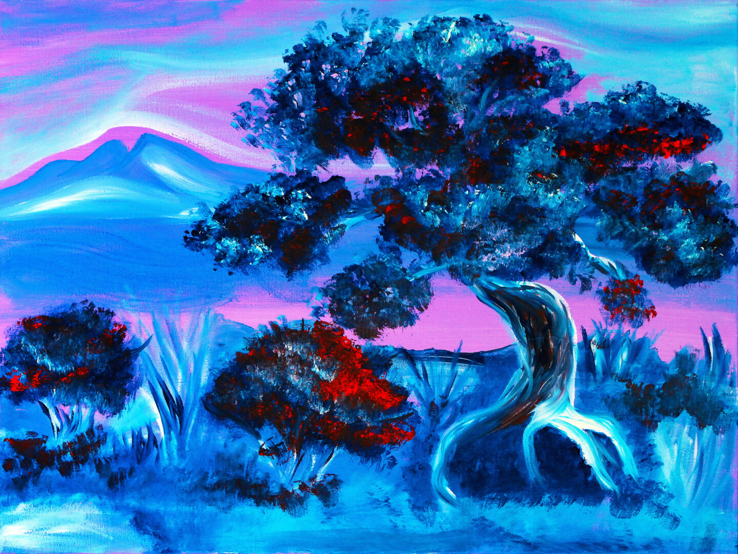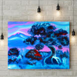Dream Tree at Dusk is a vivid exploration of color harmony and emotional depth. The glowing blue foliage, punctuated by warm red accents, creates a feeling of movement and life even in stillness. The pink-violet sky evokes serenity and introspection, while the twisted tree symbolizes endurance and transformation.