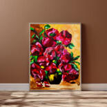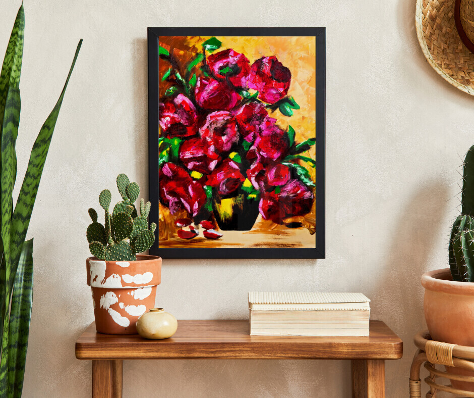 The bouquet is depicted with rich palette knife strokes, layered textures, and a bold color scheme of deep reds, pinks, and greens on a golden background. The painting radiates energy and warmth, making it a striking centerpiece for any modern interior.