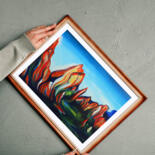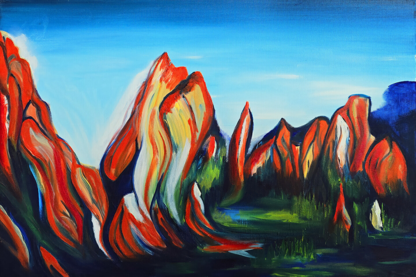 Flaming Peaks is an expressive mountain landscape that captures the raw energy of nature through vibrant red rock formations against a serene blue sky. The dynamic contrast between the fiery cliffs and deep green valley brings life, movement, and emotional intensity into the space.