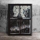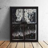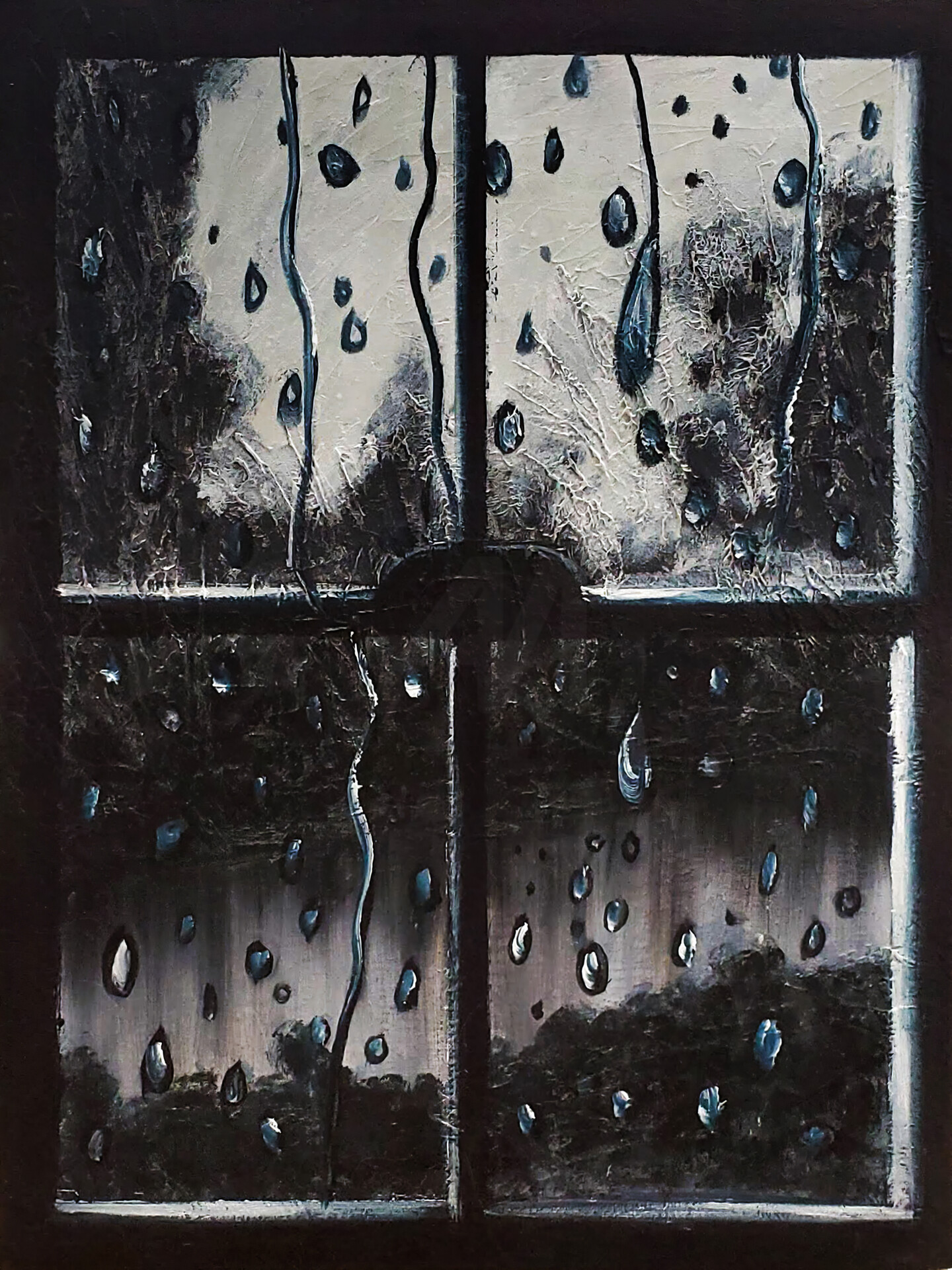 This evocative, original oil painting is a highly atmospheric and contemplative figurative study. The scene is viewed through a classic windowpane, dominated by the moody, stark contrast of black, white, and shades of grey. Large, textured raindrops run down the glass, distorting the subtle view of dark, blurred foliage and an overcast sky beyond. The composition captures the quiet, introspective mood of a rainy day, making it both dramatic and profoundly serene.