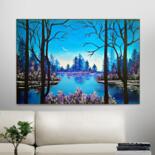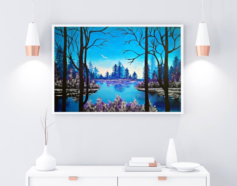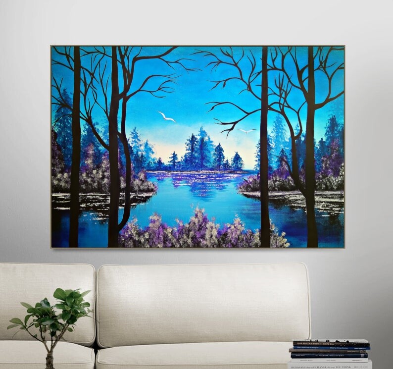 This captivating, original oil painting is a dramatic Expressionist landscape that draws the viewer into a serene yet mysterious scene. The composition is framed by the striking black silhouettes of massive trees, opening up to a lake rendered in intense cobalt blue and violet. Distant pine forests and low bushes, painted with visible texture, are reflected in the luminous water. Two small white birds cross the intensely blue sky, adding a sense of scale and freedom to the moody atmosphere.