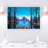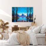 This original artwork is executed in Oil Paint on Stretched Canvas. The technique uses smooth blending for the sky and water, contrasted with thick, structural strokes (Impasto) for the foreground foliage and the silhouettes of the frame trees, enhancing the visual drama.