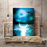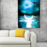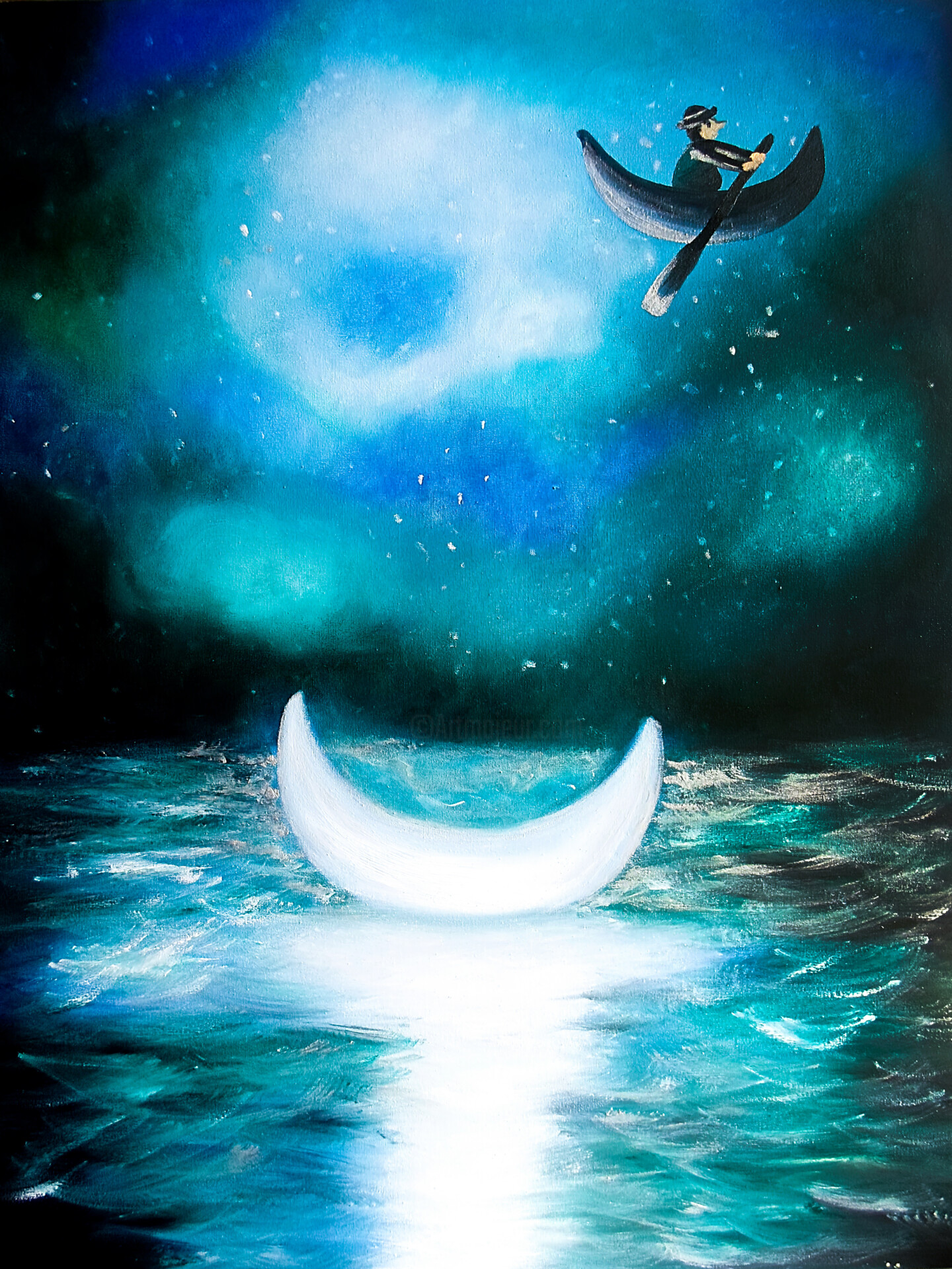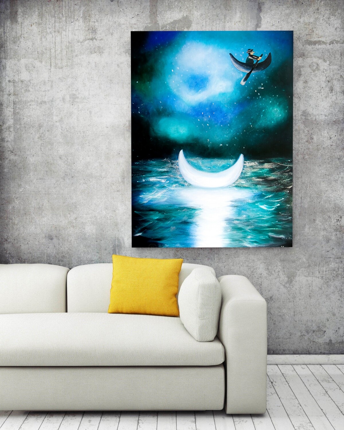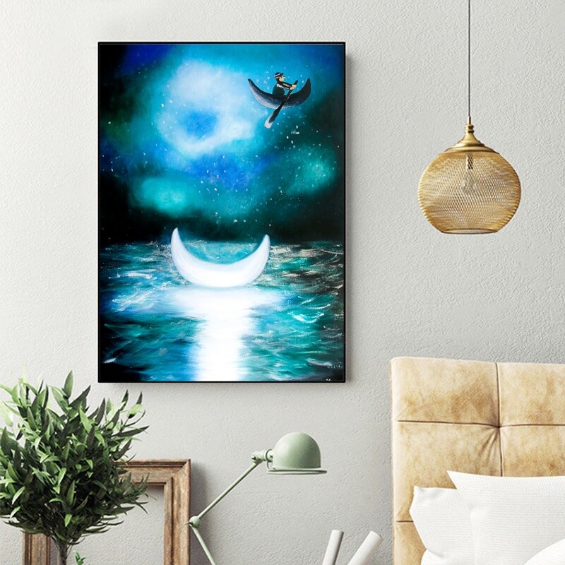 Bring magic and serenity to your home with this enchanting surreal oil painting. Featuring a lone figure rowing across a glowing night sky with a crescent moon mirrored in shimmering waters, this piece embodies calmness and mystery. Perfect for art lovers who appreciate fantasy and emotional depth, this artwork will be a stunning centerpiece for your bedroom, living room, or office.