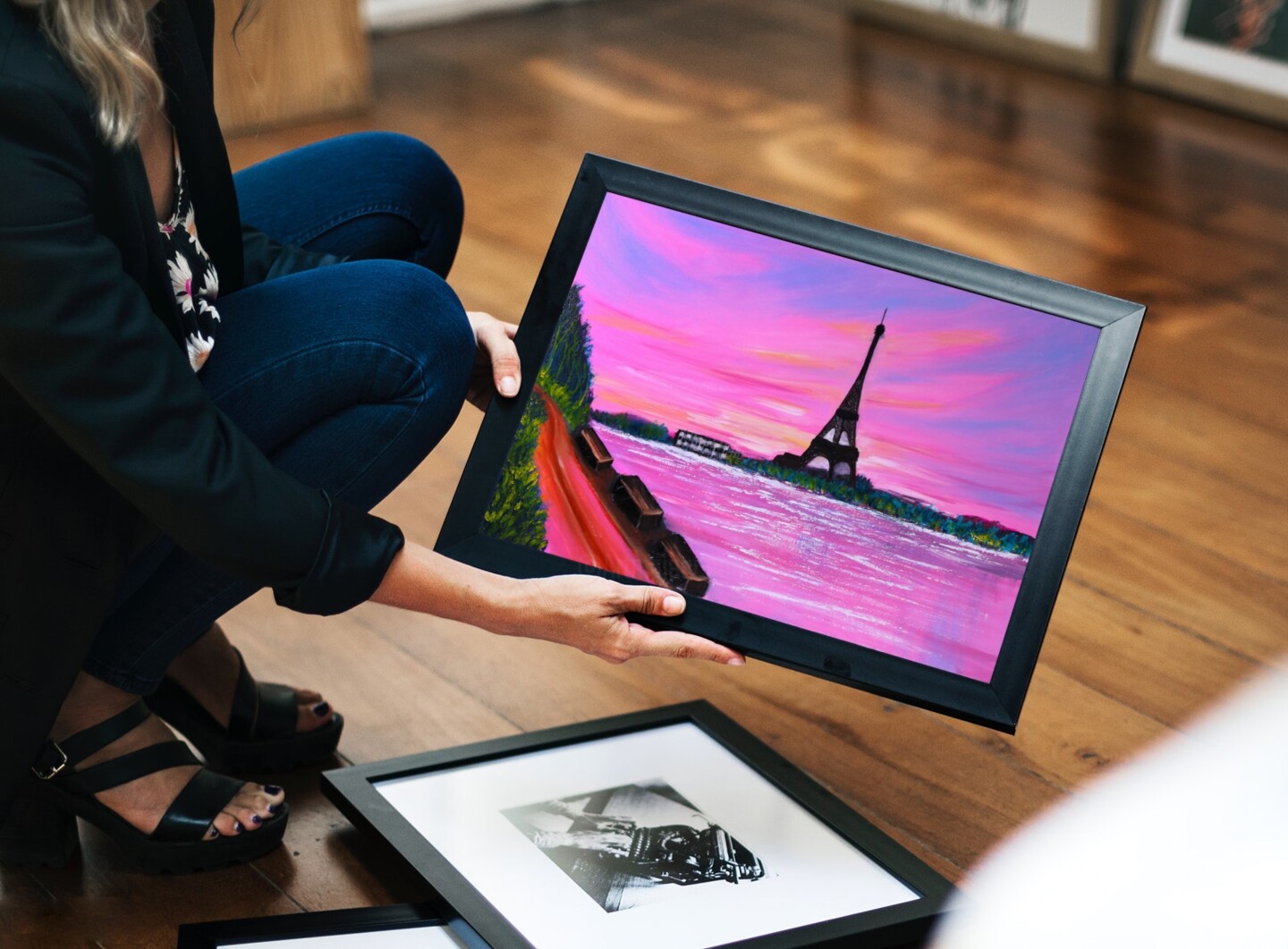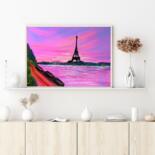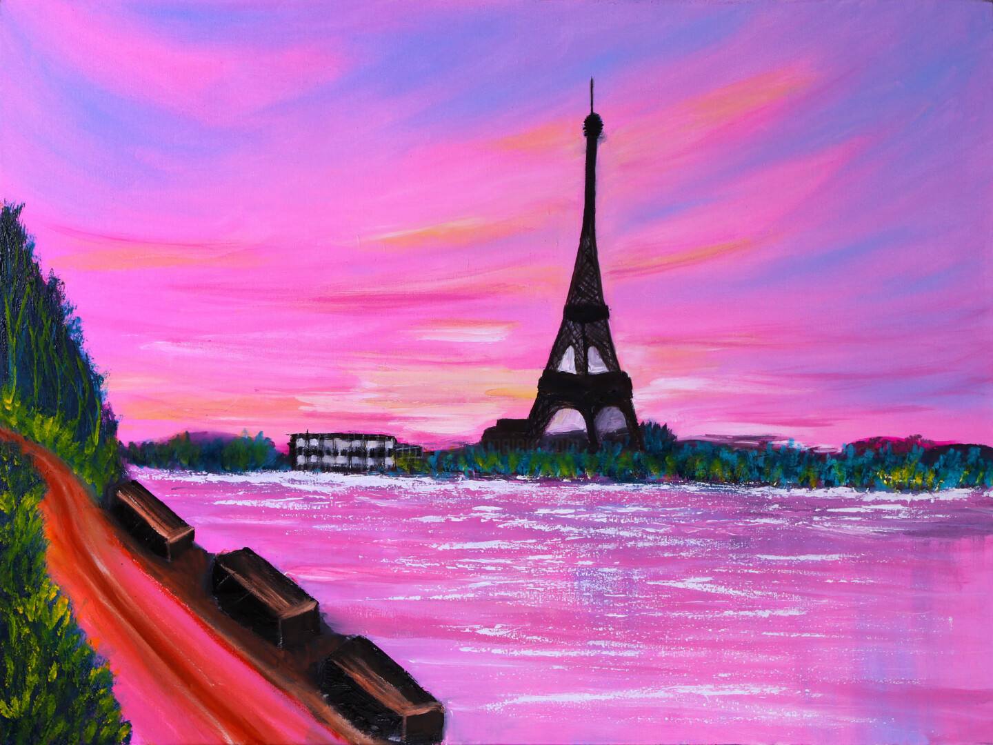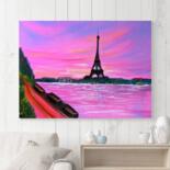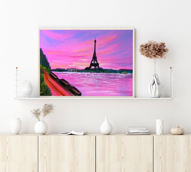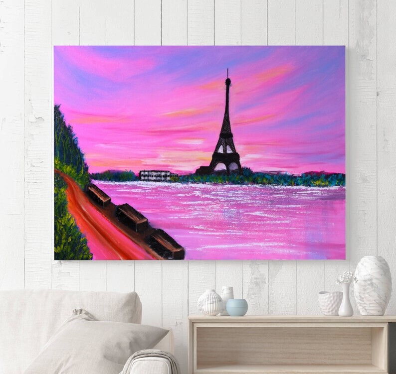 This romantic oil painting captures the Eiffel Tower silhouetted against a vivid pink sunset sky, with the Seine shimmering in soft reflections. The warm tones and dreamy atmosphere make it a perfect centerpiece for spaces that embrace elegance, travel inspiration, and a touch of romance. 🌆🇫🇷