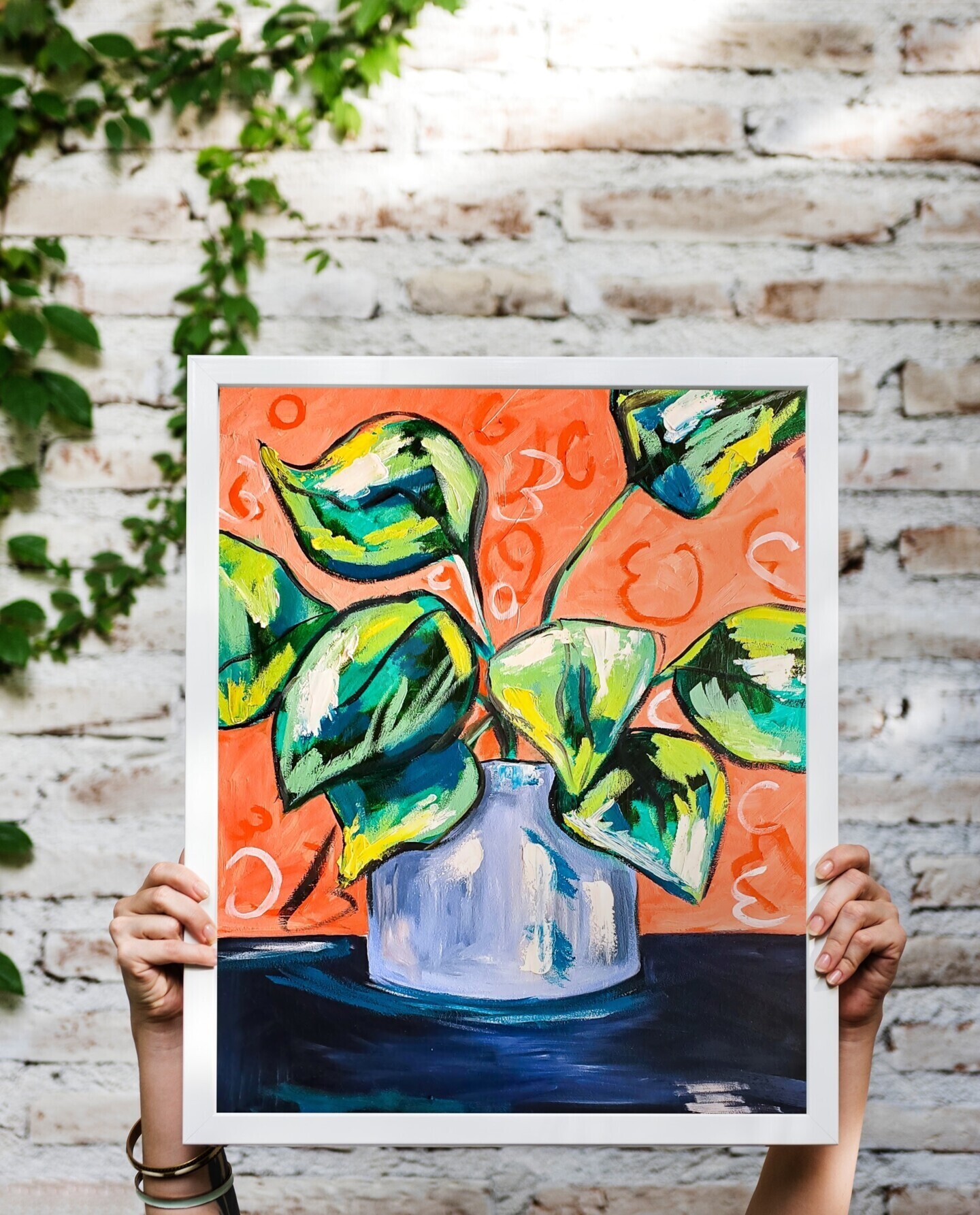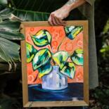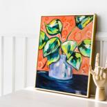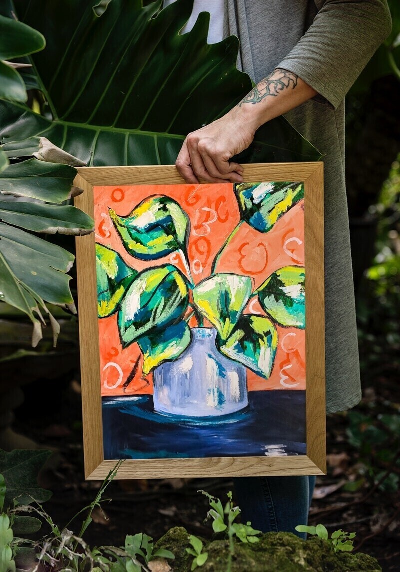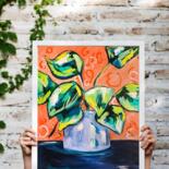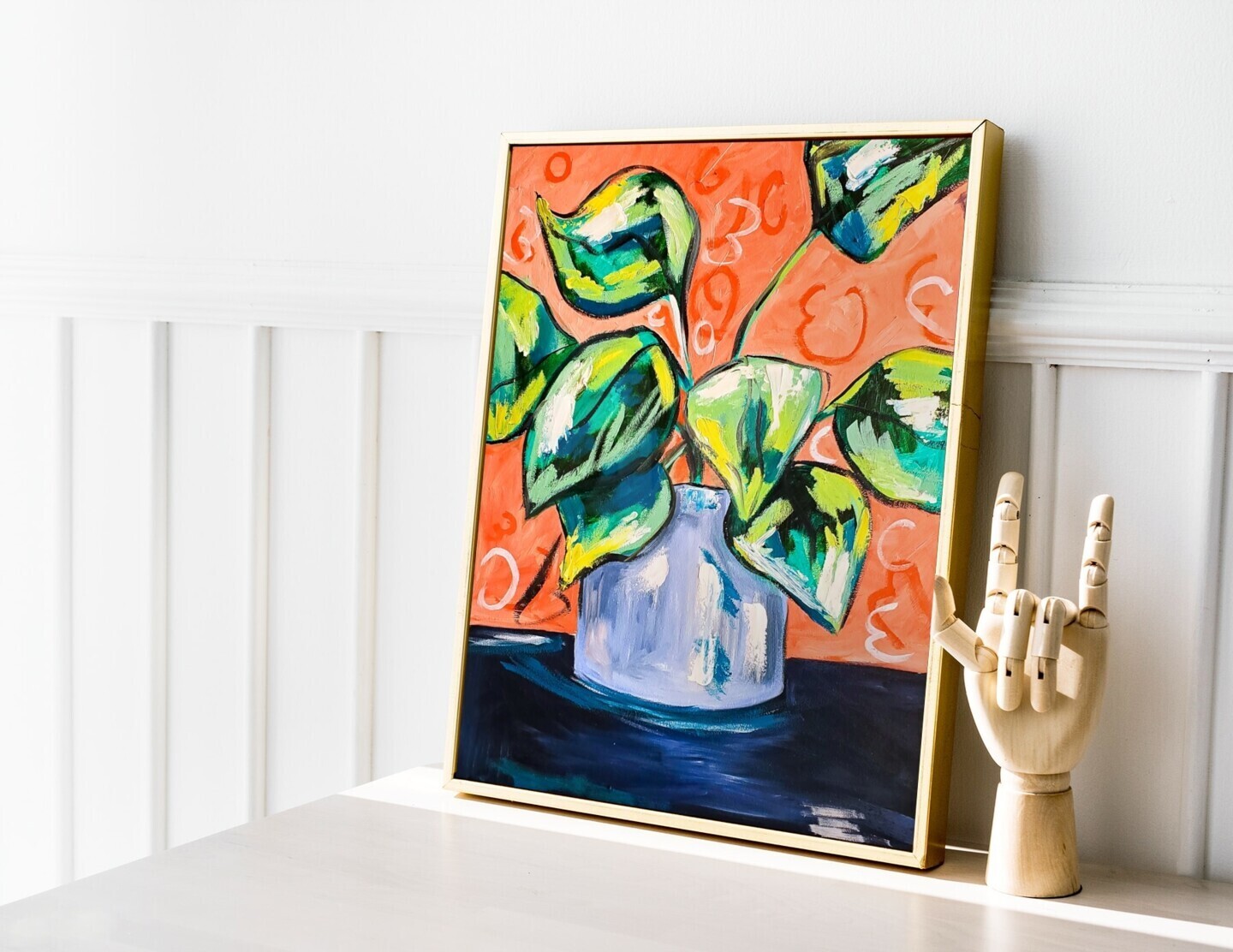 This eye-catching, original oil painting is a highly contemporary and decorative interpretation of a still life. A houseplant with bold, expressive green and yellow leaves is placed in a light blue vase, set against a dynamic coral-orange background adorned with graphic, abstract markings. The thick black outlines and saturated color blocks lend the piece a powerful, graphic quality, making it an instant focal point for a modern interior.