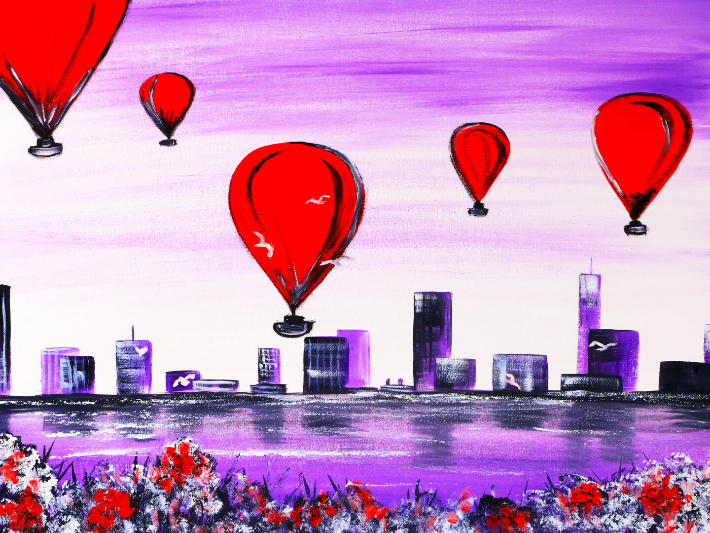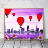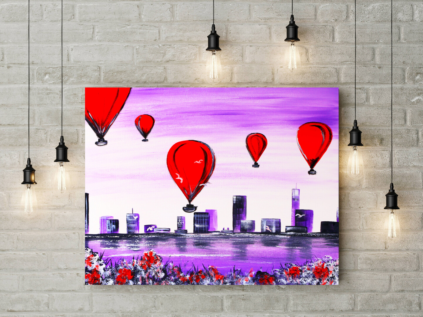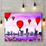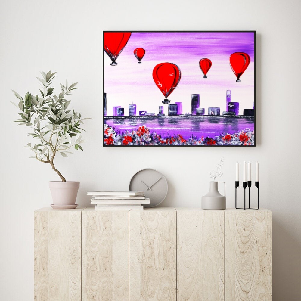 This vibrant oil painting depicts bright red hot air balloons drifting over a modern city skyline against a glowing purple sky. The contrast of bold colors and clean shapes creates an uplifting, imaginative atmosphere perfect for contemporary interiors. 🎈🌆