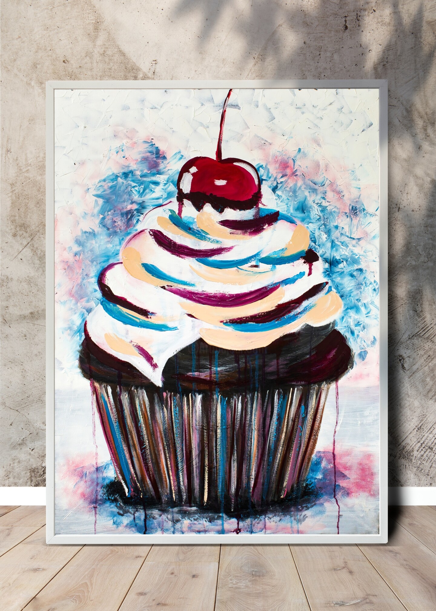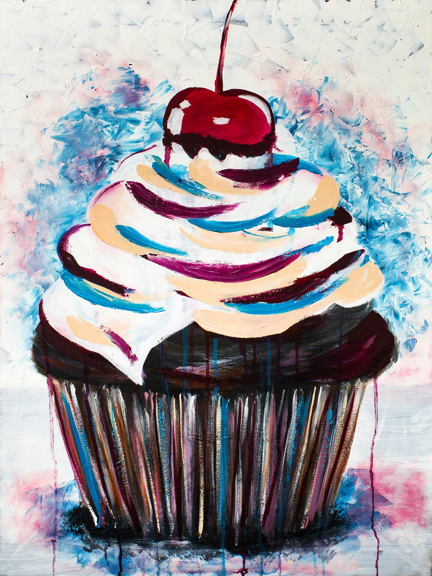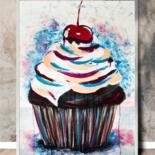 Sweet Temptation is a joyful oil on canvas artwork created in 2018, measuring 50x70 cm. The painting features a luscious cupcake topped with swirls of cream and crowned with a glossy red cherry, rendered with expressive brushstrokes and a vibrant palette. The playful drips and textured background add a dynamic, contemporary flair.
